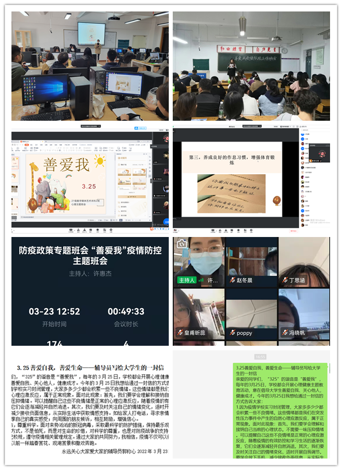 本次“3.25善爱我”心理健康教育活动倡导班级同学:第一,思想上重视疫情防控工作要求,从自我做起,从小处、细处着手,积极落实学校疫情防控要求;第二,合理饮食,爱惜身体;第三,养成良好的作息习惯,增强体育锻炼;第四,接纳自我,关爱自我,正确看待自己生活中的困难,适度释放自己的压力;第五,尊重他人,关心室友,关爱身边的同学和朋友,营造和谐的宿舍氛围和班级氛围。太阳集团tyc各位辅导员和班级心理委员积极组织开展各种形式的“3.25善爱我”心理健康教育活动,有的班级通过开展线上线下“善爱我”主题班会,还有的班级通过线上进行“3.25善爱我”心理健康知识宣传活动。