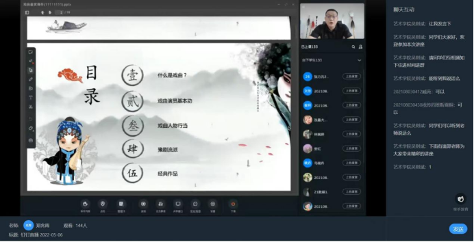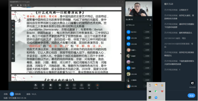 为了弘扬传统文化,传承戏曲精髓,2022年5月6日下午17:00,公共艺术教育中心特邀河南艺术职业学院戏曲学院副书记郑兆雨老师,以钉钉直播的方式,在线上为师生们带来了一场题为《中国传统艺术“戏曲”的魅力》的精彩讲座。