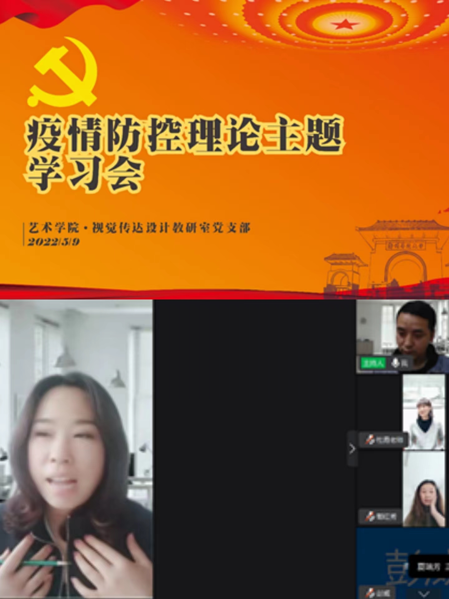 2022年5月9日,为筑牢校园疫情防控安全屏障,太阳集团tyc视觉传达设计教研室党支部组织“疫情防控”主题党日活动。会议使用钉钉线上视频会,视觉传达设计教研室全体教师党员参会,会议由支部书记夏瑞芳主持。