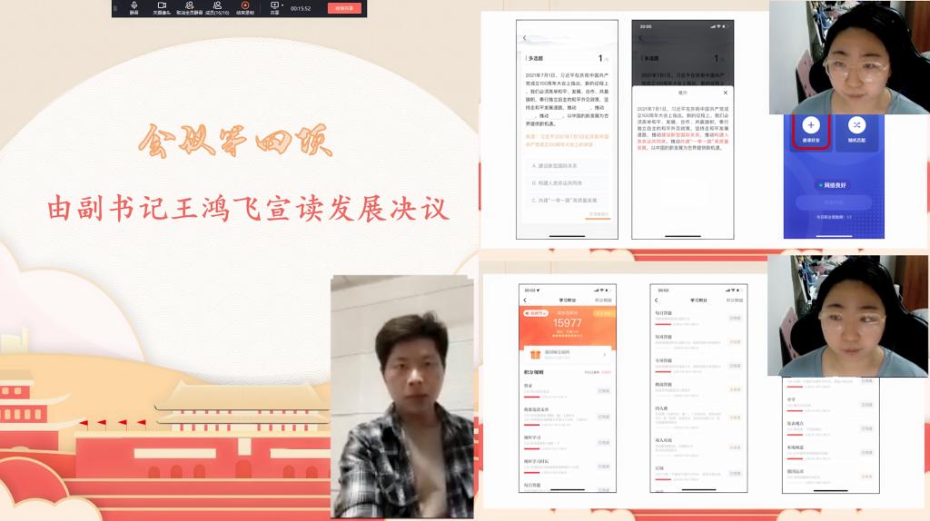 此次会议主要是讨论党员发展对象郜钰奇、刘佳、赵子腾3名同志发展成为预备党员的问题。此次会议共有5个议程,第一个议程是由党员发展对象郜钰奇、刘佳、赵子腾3名同志进行自我介绍,并就入校以来的思想、学习、工作情况做了汇报,一一宣读《入党志愿书》表明自己的入党动机。第二个议程是由此次党员发展对象的入党介绍人杨萌玮老师、魏双双老师介绍对3名党员发展对象的培养情况,并对其能否入党标明意见。杨萌玮老师、魏双双老师一致认为,郜钰奇、刘佳、赵子腾3名同志已基本具备中共预备党员标准,同意接收其为中共预备党员。第三个议程是由参会的支部中共党员杨萌玮同志、王鸿飞同志、周冰冰同志对郜钰奇、刘佳、赵子腾3名发展对象能否接收为中共预备党员进行讨论并发表意见,与会全体中共党员认为3名同志均符合中共预备党员标准,同意接收。同时,拥有表决权的中共正式党员进行投票表决,最终,郜钰奇、刘佳、赵子腾3名发展对象被接收为中共预备党员。会议第四个议程就是由支部副书记王鸿飞同志宣读发展决议。会议第五项议程由中共预备党员郜钰奇、刘佳、赵子腾3名同志表明自己的态度。他们许下了对党的庄重誓言,言明了未来努力的方向。会议的最后,支部书记杨萌玮同志向3位中共预备党员强调了发展后的要求和准则,并为大家讲解了学习强国的答题技巧与每日学习经验。至此,本次大会圆满结束。