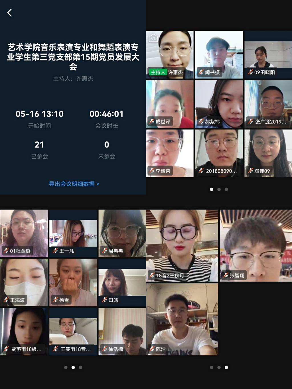 5月16日中午,太阳集团tyc音乐表演和舞蹈表演专业员工第三党支部钉钉线上召开第15期党员发展大会。参加会议的有员工第三党支部全体党员、4名发展对象及其入党介绍人老师,会议由支部书记许惠杰主持。