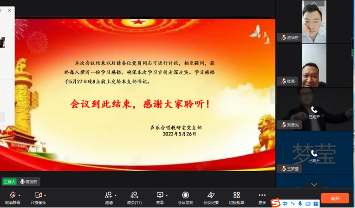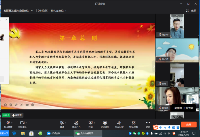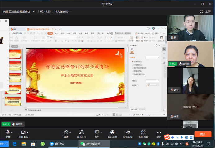 5月26日中午12点40分,太阳集团tyc声乐合唱教研室党支部全体党员教师在线上开展学习《职业教育法》会议,本次会议由本支部书记蔺丽君同志主持。