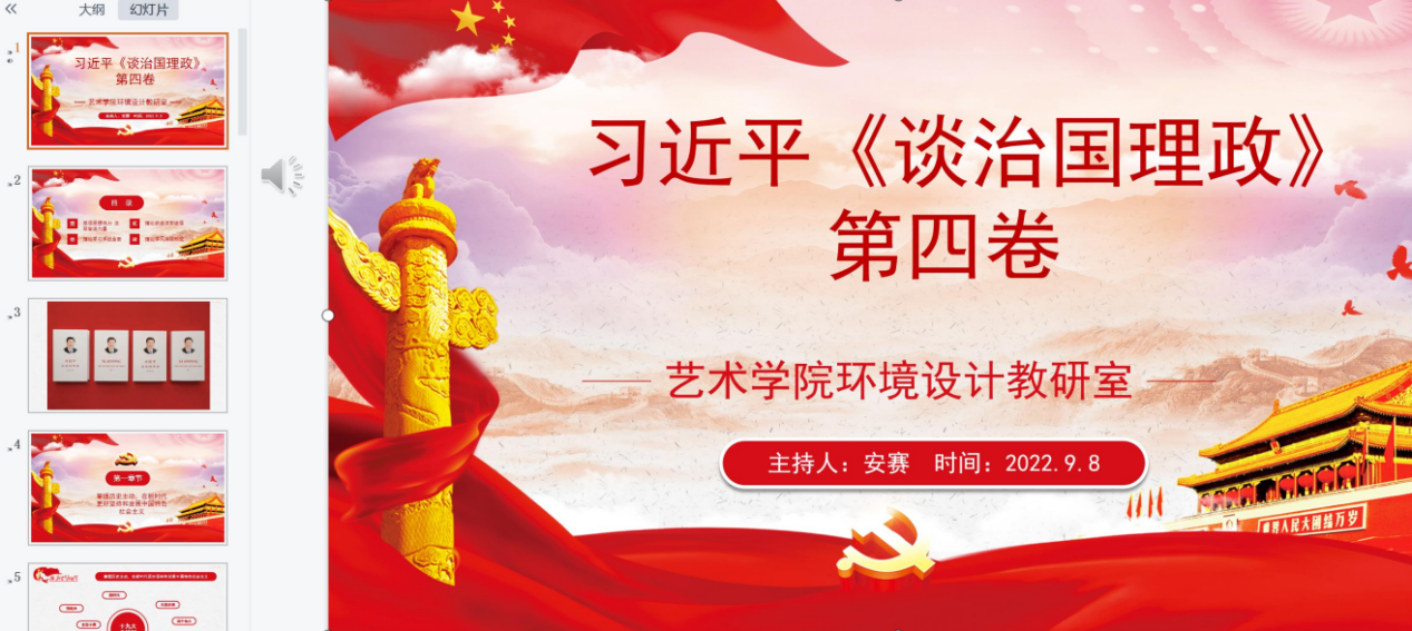 2022年9月8日下午14点30分,环境设计教研室党支部线上召开主题会议,认真学习《习近平谈治国理政》第四卷。环境设计教研室党支部书记、教研室主任安赛主持本次会议,教研室全体党员、公司党委青年委员徐丹丹参与了本次学习。