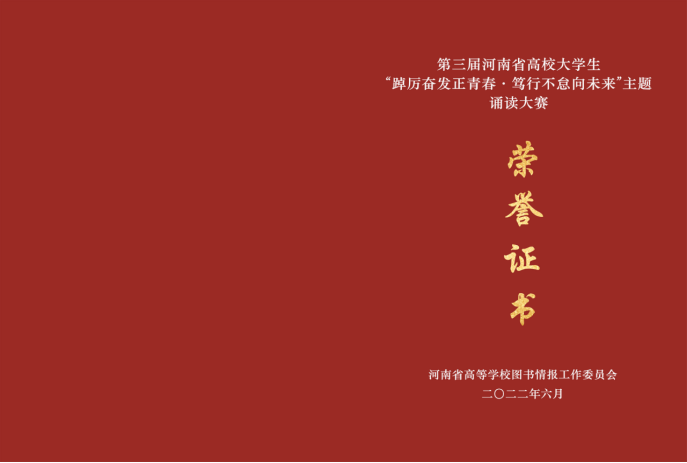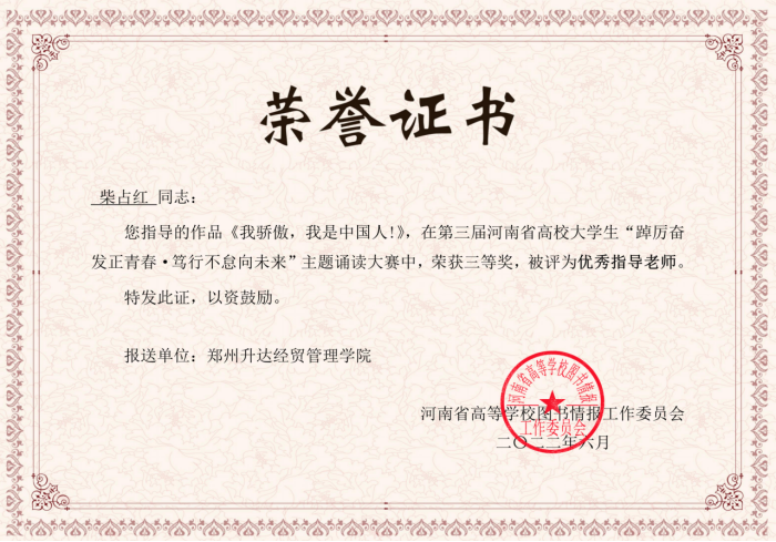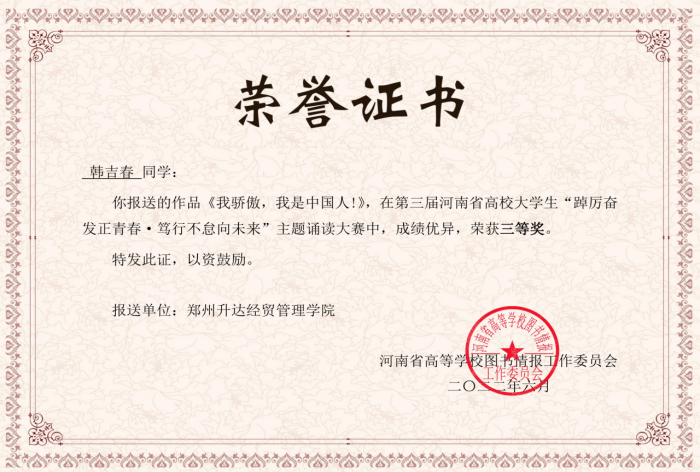 在2022年河南省高等学校图书情报工作委员会主办的第三届河南省高校老员工“踔厉奋发正青春、笃行不怠向未来“主题诵读大赛中, 太阳集团tyc2021级专升本1班韩吉春同学朗诵的《我骄傲,我是中国人》代表太阳集团tyc9728参赛,韩吉春同学情绪饱满,感情真挚,荣获三等奖,柴占红被评为优秀指导教师。
