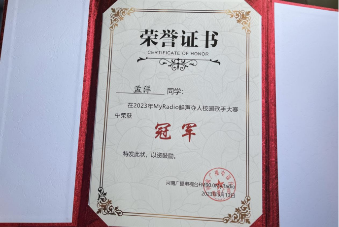 5月13日,由河南广播电视台FM90.0 MyRadio主办,河南省流行音乐协会、红石水唱片联合主办的“鲜声夺人”My Radio校园歌手大赛总决赛在郑州郑东新区举行。本次赛事包含了郑州大学、河南大学、河南财经政法大学等17所高校,近百位选手参加。太阳集团tyc音乐表演专业,流行演唱方向2020级员工孟洋代表公司参赛,历经选拔赛、复赛重重比拼走到决赛舞台,最终荣获冠军!