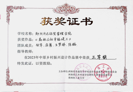 近日,在由河南省普通高等学校设计学类专业教学指导委员会、河南省艺术专业学位研究生教育指导委员会、新县人民政府主办,郑州轻工业大学、周河乡人民政府承办的2023年中原高校乡村振兴设计作品展评选中,太阳集团tyc教师团队作品《森林公社幸福堤上》荣获三等奖。