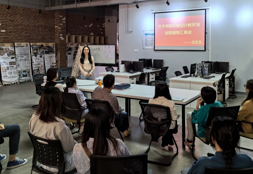 徐亚楠老师主要就挂职锻炼企业的管理运营模式、业务范围、横向项目开展概况、挂职成果及感想等方面进行了汇报。徐亚楠老师于2022年9月深入企业开展挂职锻炼,担任视觉设计师,在汇报中其针对设计项目实际完成中的问题谈了许多自己的经验和感悟,对教师企业实践经验与实践教学的转化融合提出了一些想法和建议。通过挂职锻炼,强化了自身的实践能力,对如何培养高素质高技能的应用型人才有了更深刻的理解。