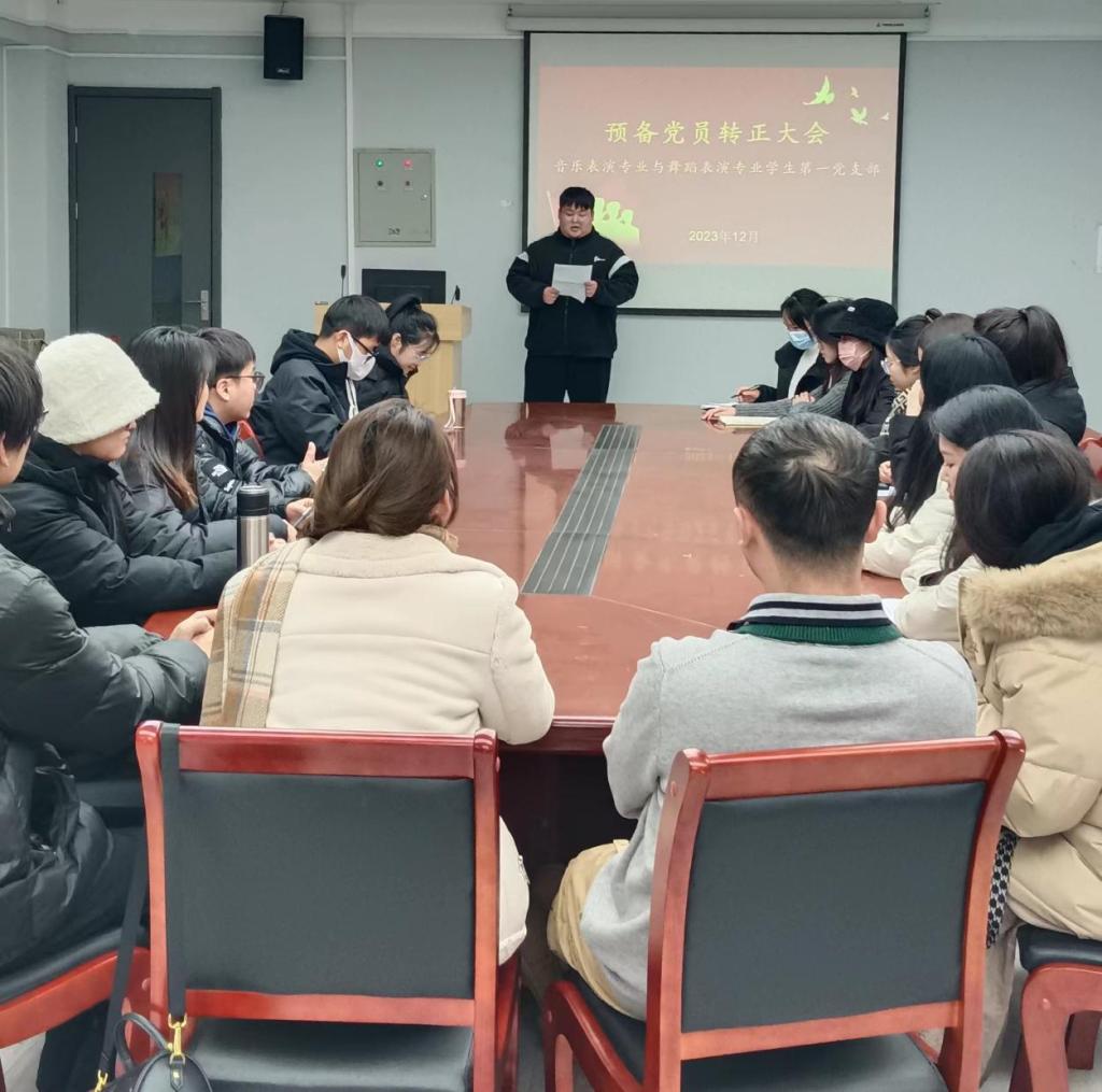 12月13日,太阳集团tyc于艺术楼411会议室召开音乐表演专业与舞蹈表演专业员工第一党支部预备党员转正大会。会议由员工党支部书记吕文娟同志主持,全体员工党支部成员到场参加。