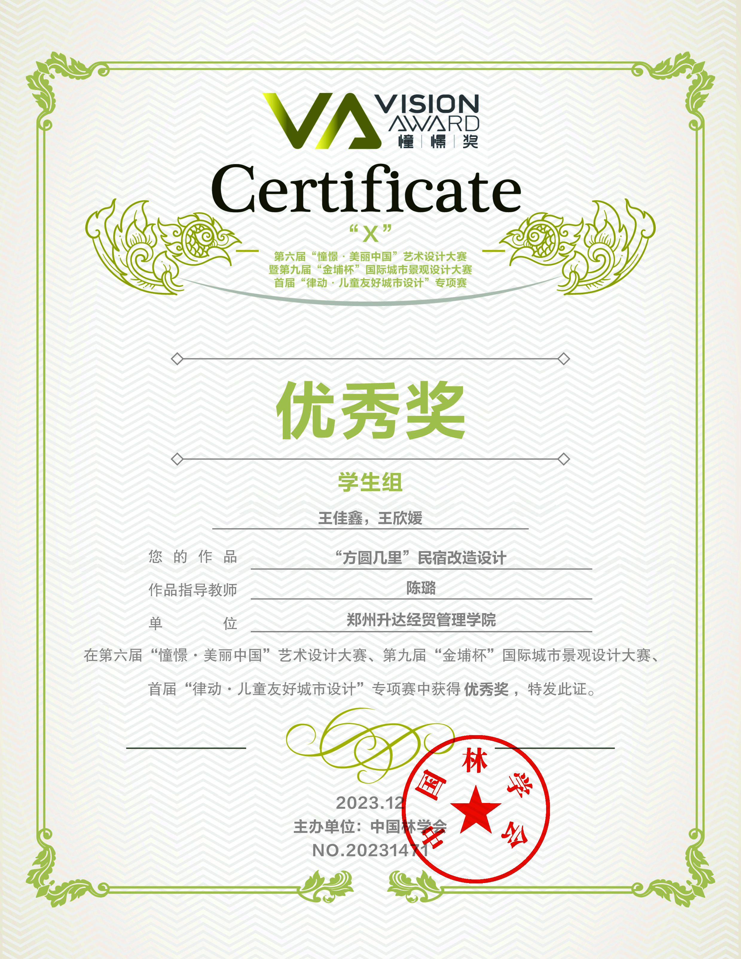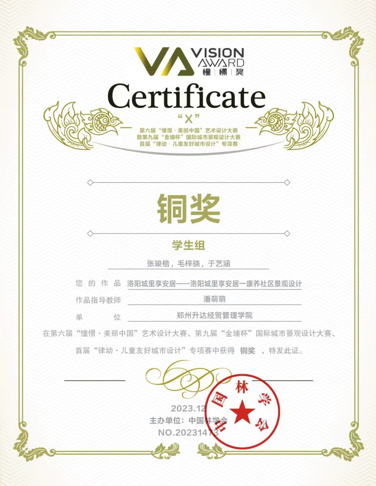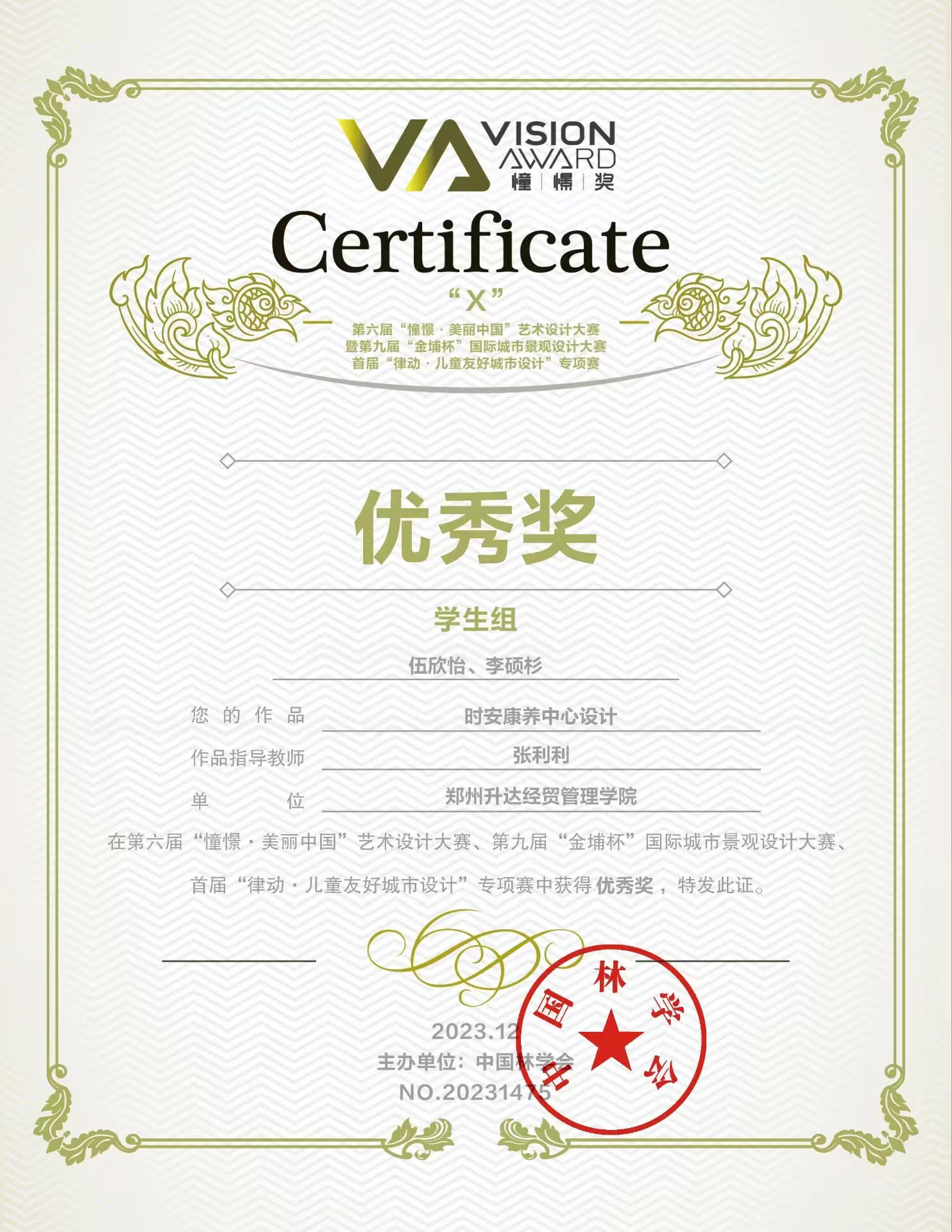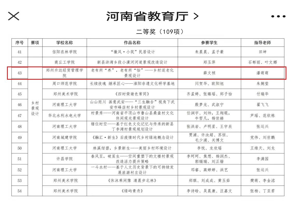 在河南省教育厅主办的2023“设计河南”系列比赛开始之际,学院领导给予高度重视,安排专业教师深耕课堂教学,鼓励创新创意,积极组织员工参赛,进行作品甄选,最终,在“印记中原”河南省老员工乡村设计大赛中,公司薛文祯同学的设计作品《老有所养,老有所怡—乡村适老化景观设计》荣获二等奖。