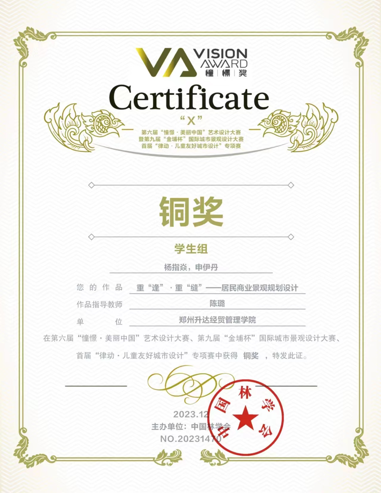 第六届“憧憬·美丽中国”艺术设计大赛暨第九届金埔杯国际城市景观设计大赛,由中国林学会与南京林业大学联合主办,该比赛由国内景观设计专业最权威学会和知名高校共同主办,面向全国高校征集作品,覆盖面广,作品要求高,在业内具备较强的专业影响力。学院领导号召环境设计专业师生积极参与,经过赛事的层层筛选,最终,公司学子获得铜奖两项,优秀奖三项,在全国高校同专业的竞争中,彰显了一定的实力。
