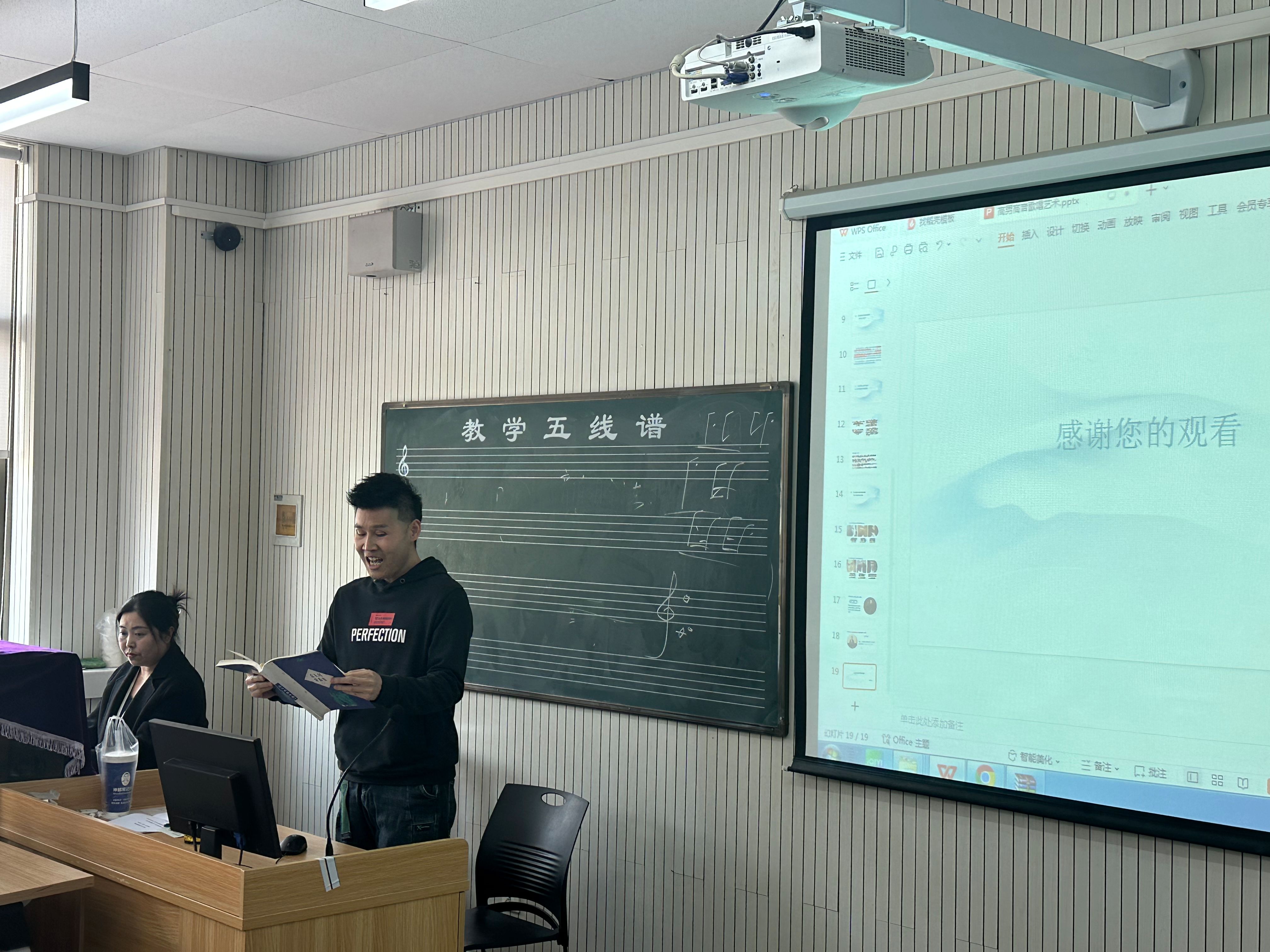 在教研过程中,刘新义老师不仅通过讲解和演示,还结合了精选的视频资料,让教师们能够更直观地感受到高男高音的魅力和演唱技巧。他鼓励教师们在教学中注重实践与理论相结合,通过多种教学手段和方法,激发员工的学习兴趣,提高他们的学习效果。