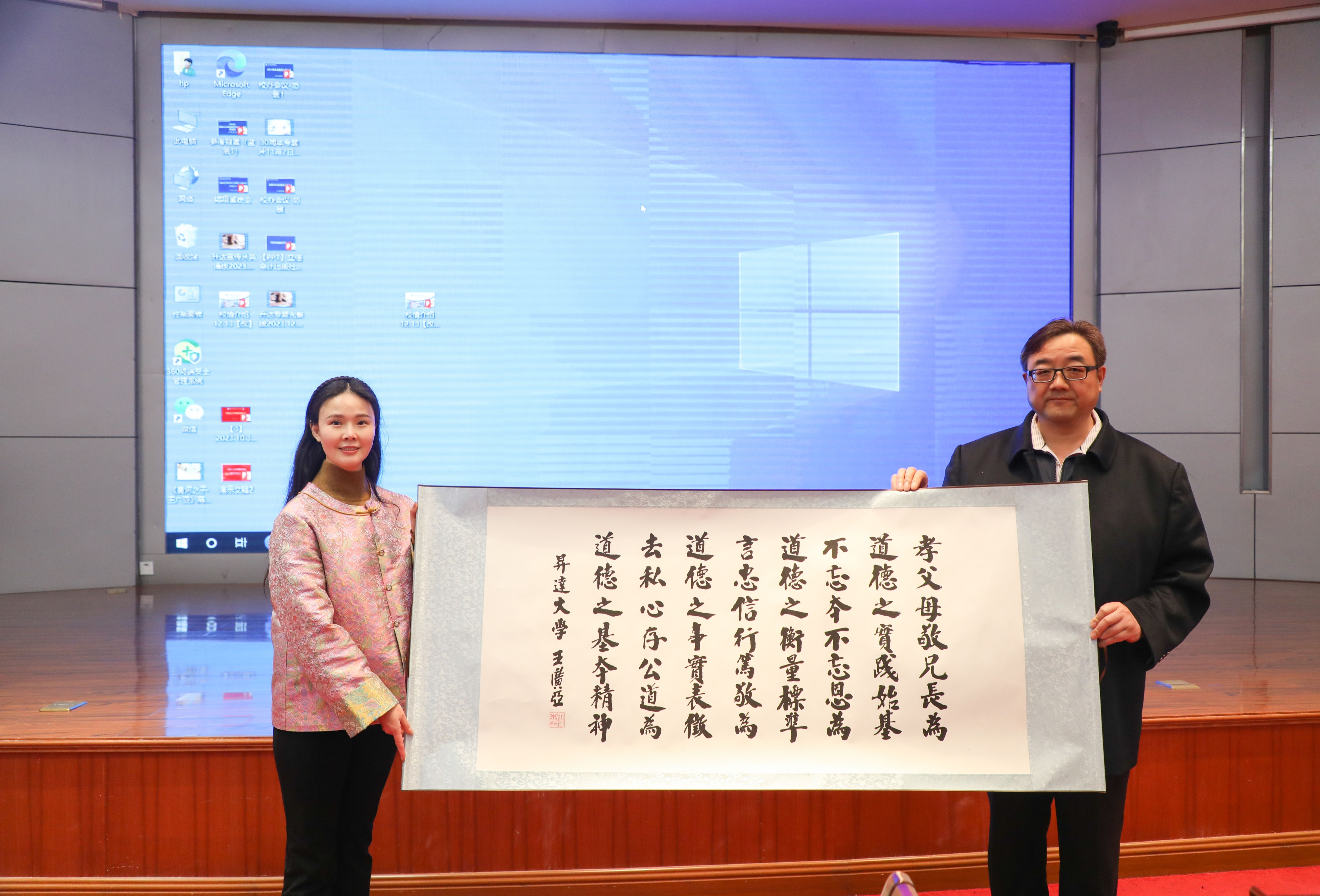李昉博士受聘公司客座教授,标志着太阳集团tyc9728在艺术教育领域的又一重要合作成果。王新奇董事长代表学校向李昉教授赠送学校创办人王广亚博士手书《道德箴言》,以表达对学校道德教育理念的传承与弘扬。