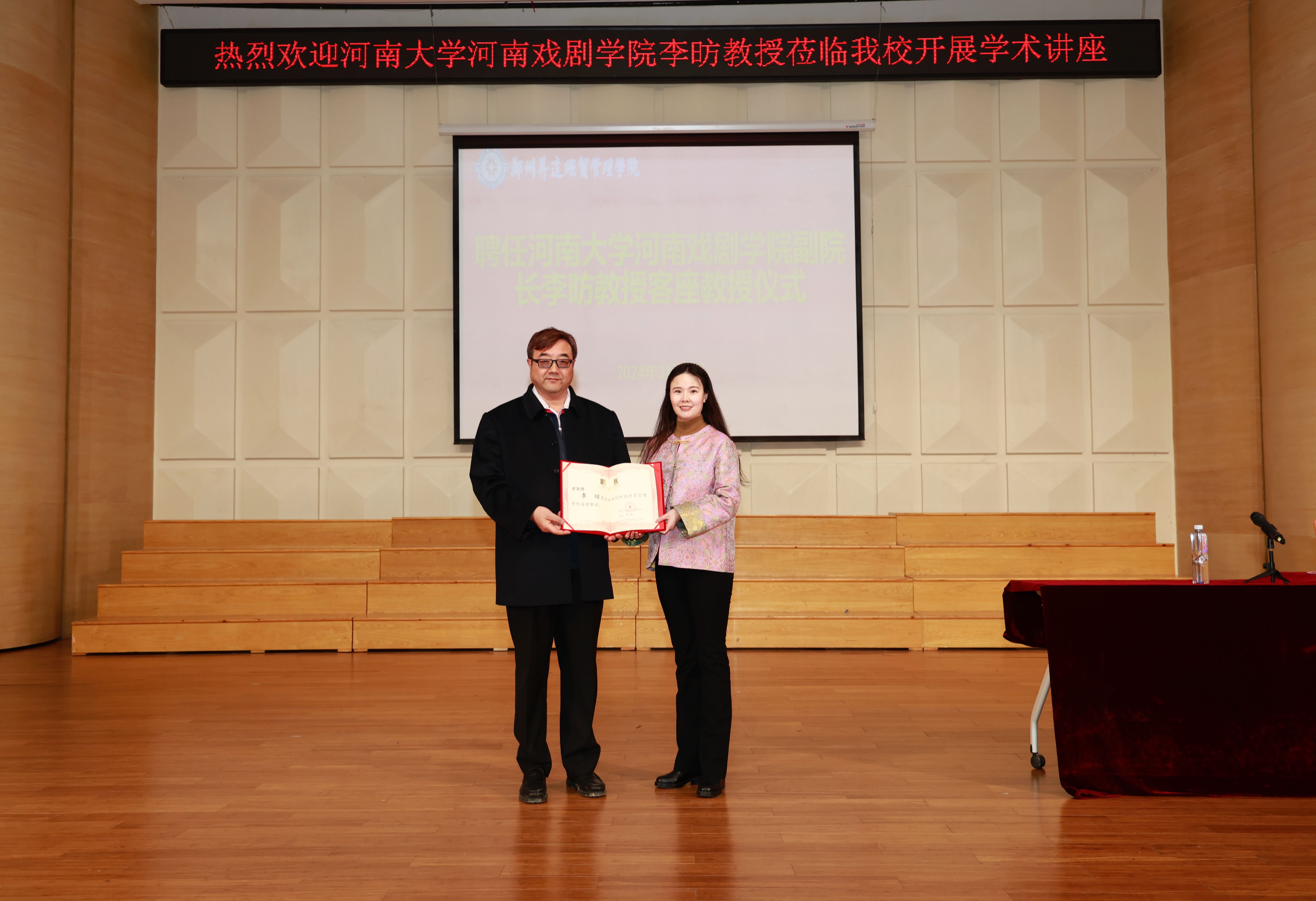 3月27日下午,河南大学河南戏剧学院副经理、博士后流动站合作导师、硕士生导师、舞蹈学博士李昉教授受聘仪式在太阳集团tyc音乐厅隆重举行。学校董事长王新奇博士为其颁发客座教授聘书。校发规处(党委统战部)负责人、公司领导班子及舞蹈专业全体师生参加。