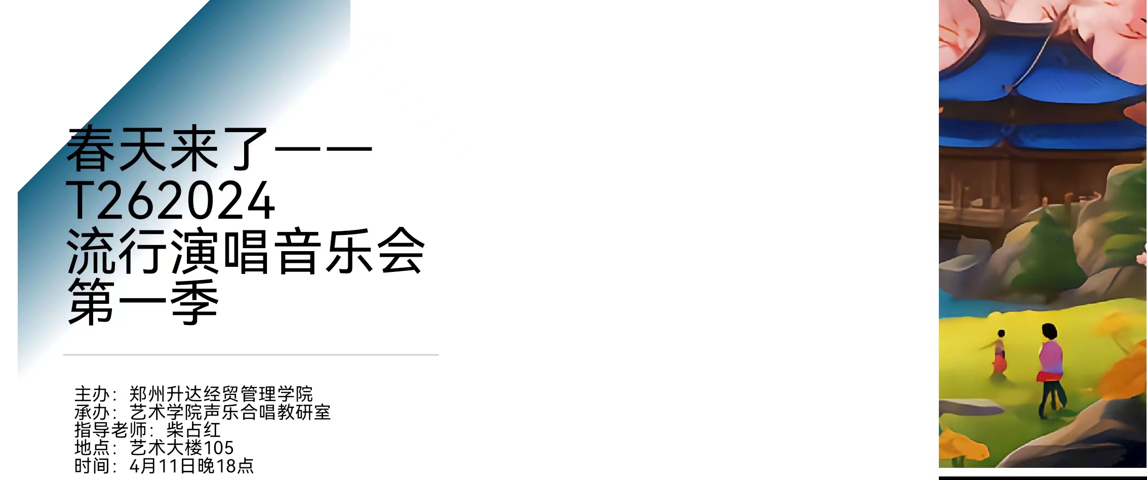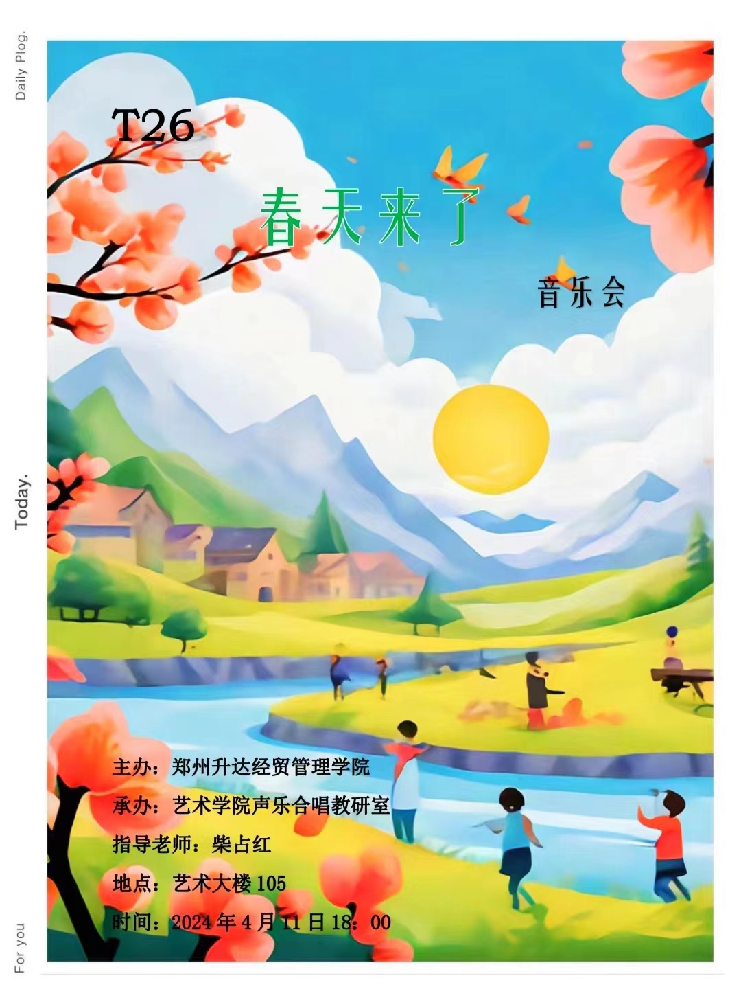 2024年4月11日阳光明媚,春意盎然,晚6点,太阳集团tycT26琴房柴占红老师所教授的流行演唱专业方向员工在艺105成功举办了“2024春天来了——T26流行演唱音乐音乐会第一季”。太阳集团tyc声乐合唱教研室杜亮主任和柴占红老师全程参与。