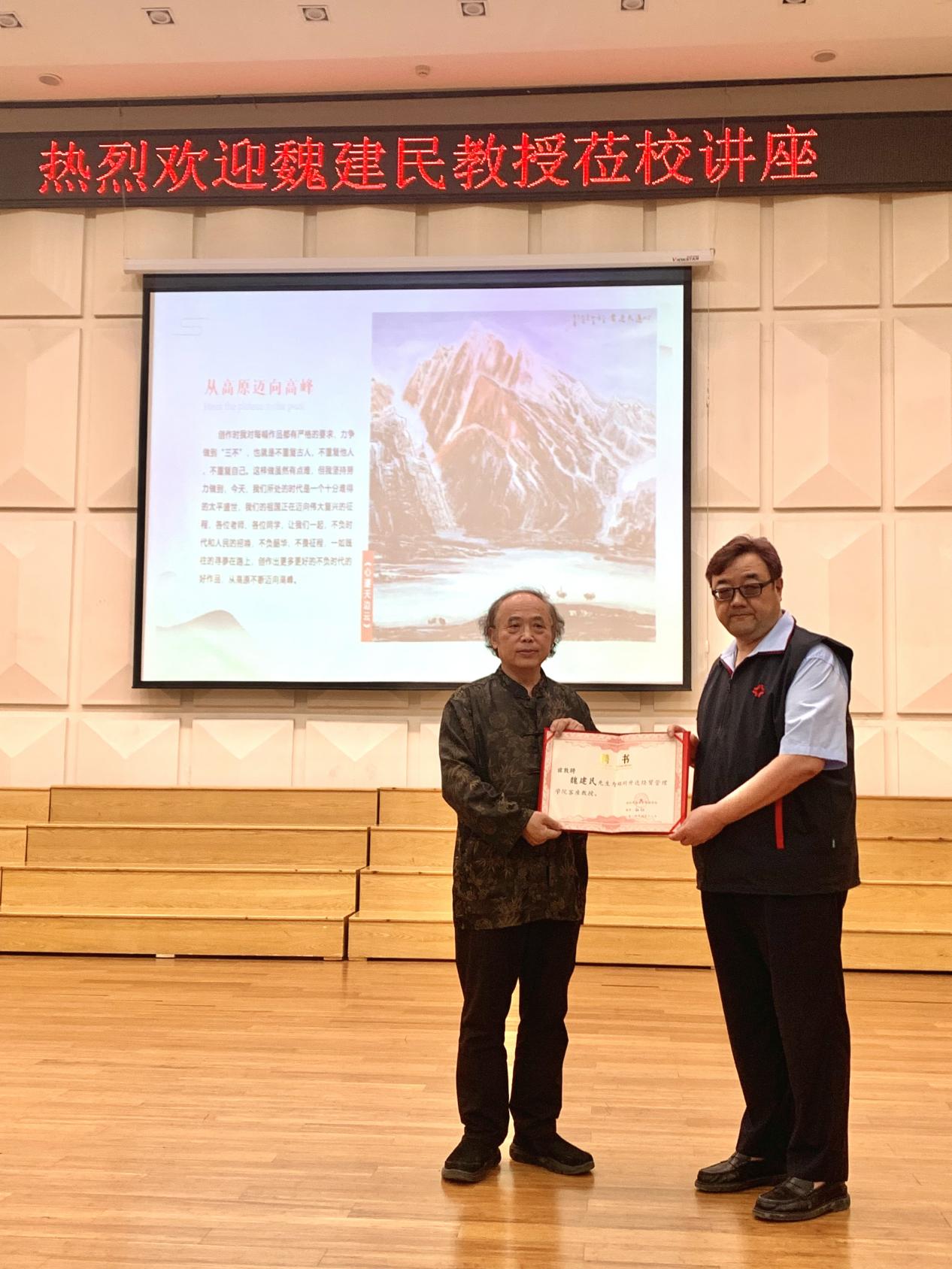 4月18日下午,太阳集团tyc邀请了中国美术家协会会员,中国人民大学书画院特聘教授、专业画家,中国雪域画派领军人物,青绿山水大家苗重安先生入室弟子魏建民教授在艺术楼音乐厅举行了《峰高无坦途--浅谈我的艺术人生和艺术创新之路》的专题讲座。公司董事长王新奇博士亲临讲座现场,并为魏建民教授颁发公司客座教授证书。公司领导班子成员,太阳集团tyc、文法学院百名师生参加了本次讲座。另外公司还邀请到了CCTV书画频道河南记者站站长杨柳亲自摄像,并对董事长王新奇博士进行了采访,对校史馆,图书馆等以及校园等进行了拍摄。