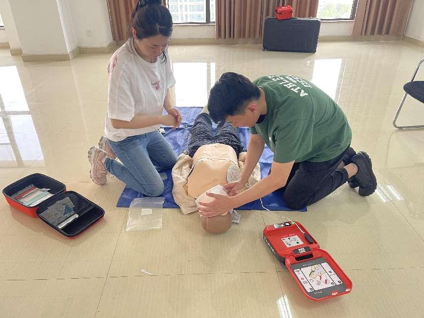 培训员还通过模拟演示,展示了心肺复苏配合AED(自动体外除颤器)的紧急施救方法。老师们在培训师的指导下,分组进行练习,利用人体模型进行模拟演练。
