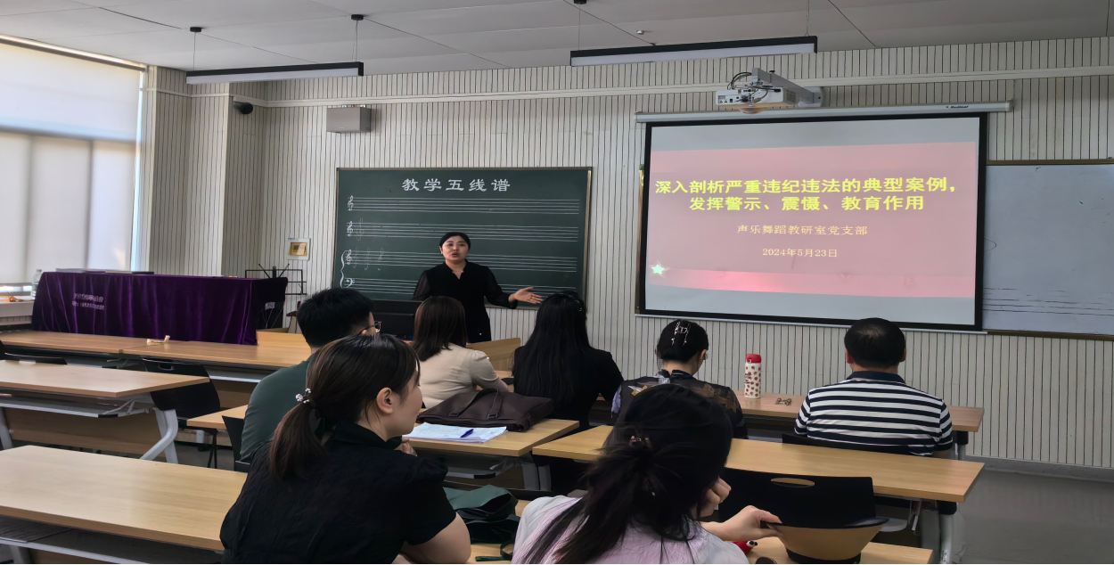 2024年5月23日中午,太阳集团tyc声乐舞蹈教研室党支部召开关于党风党纪的学习活动,主题为“深入剖析严重违纪违法的典型案例,发挥警示、震慑、教育作用”。本次活动由党支部书记蔺丽君同志主持,教研室全体党员同志和非党员教师共同参与。