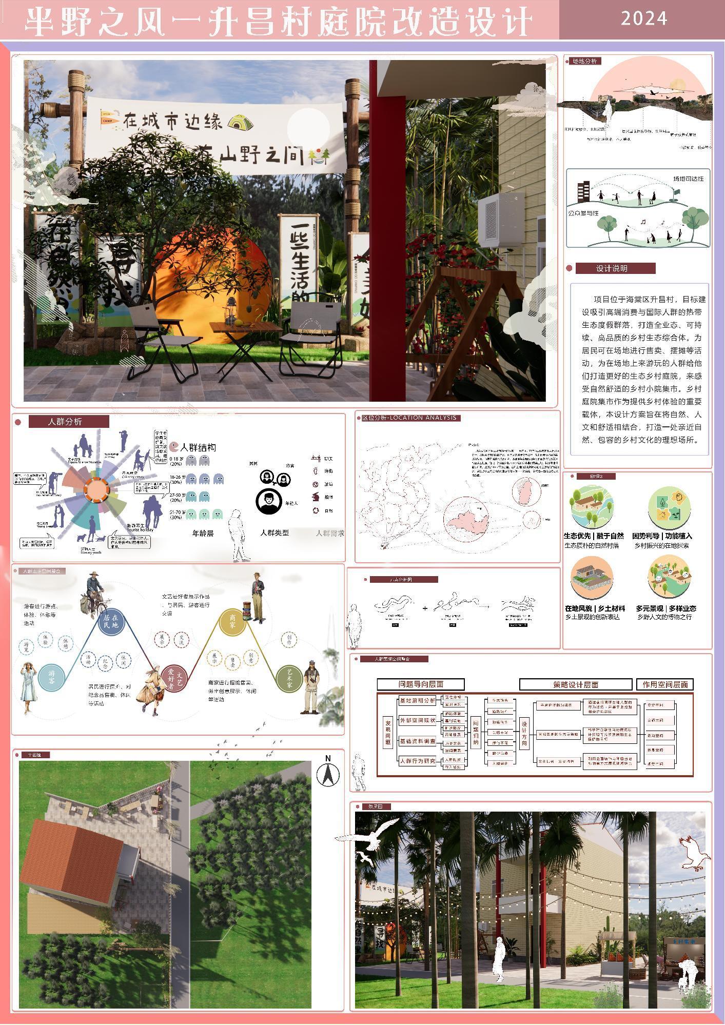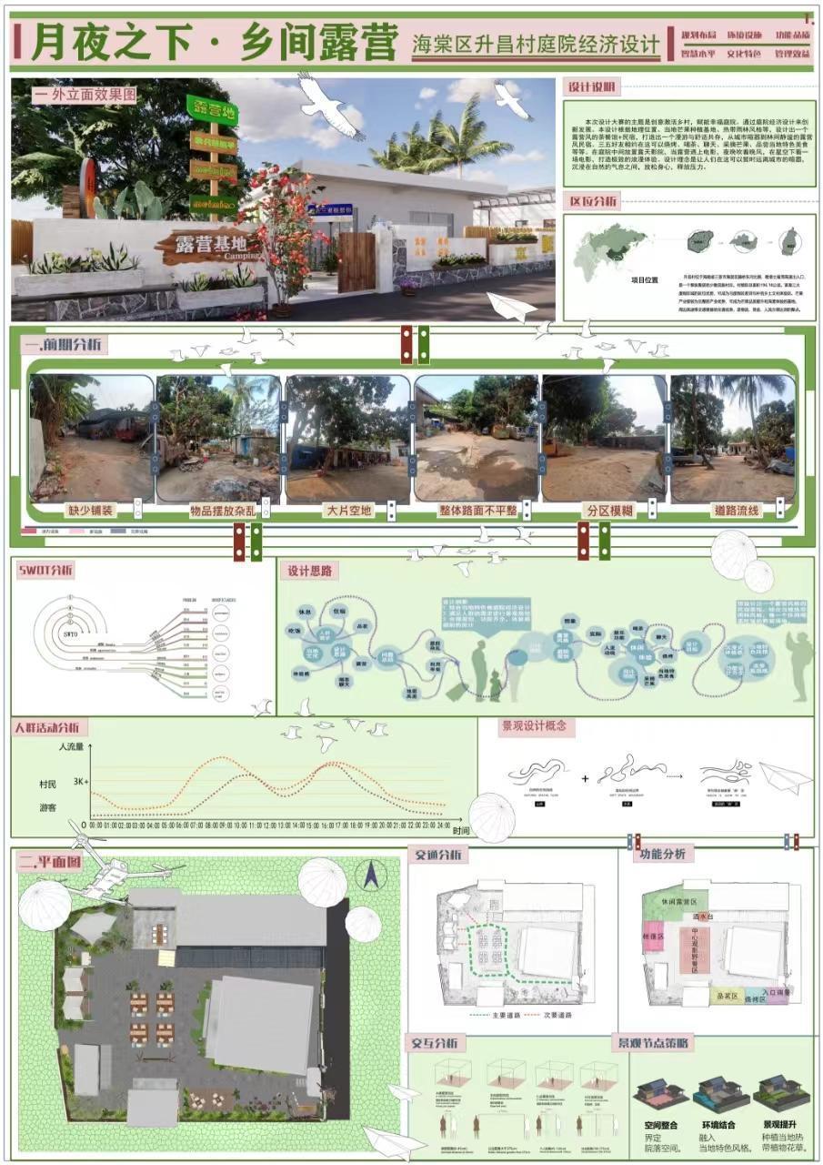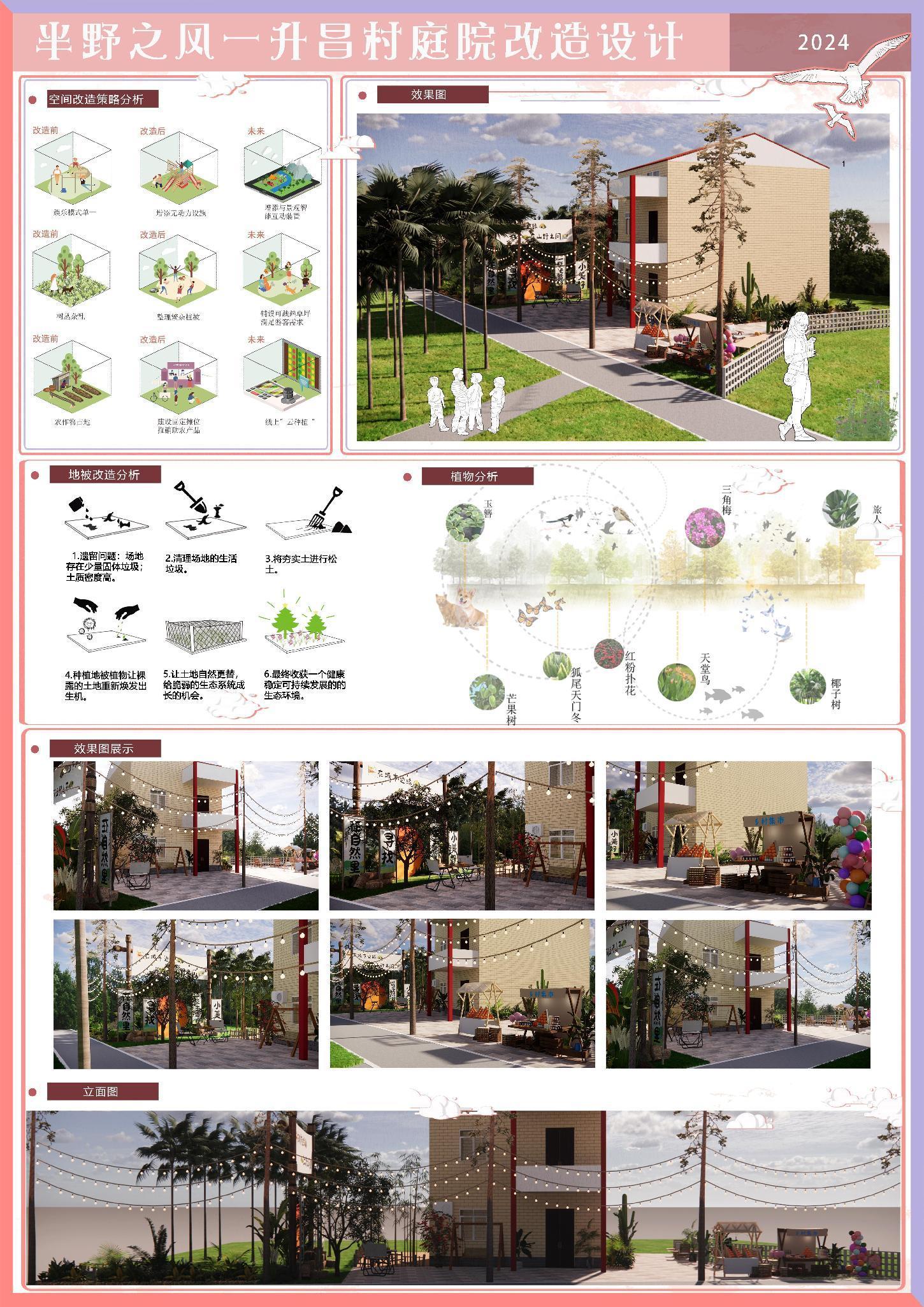 此次工作营地点位于海南省三亚市海棠区,经过前期校企联合策划、报名、面试,最终公司环境设计专业文小荣、赵孟杰两位同学成功入选,在企业驻场设计师的指导下,深入到项目现场开展一系列实地调研、走访、测量,根据村民诉求与相关设计要求进行方案建模、绘制CAD图、效果图等,并在完成工作的同时,积极参加由海棠区委农村工作领导小组办公室、区委宣传部、农业农村局、和美乡村建设领导小组办公室主办的海棠区首届“和美乡村·幸福庭院”设计营造大赛,获得一二三等奖数项。
