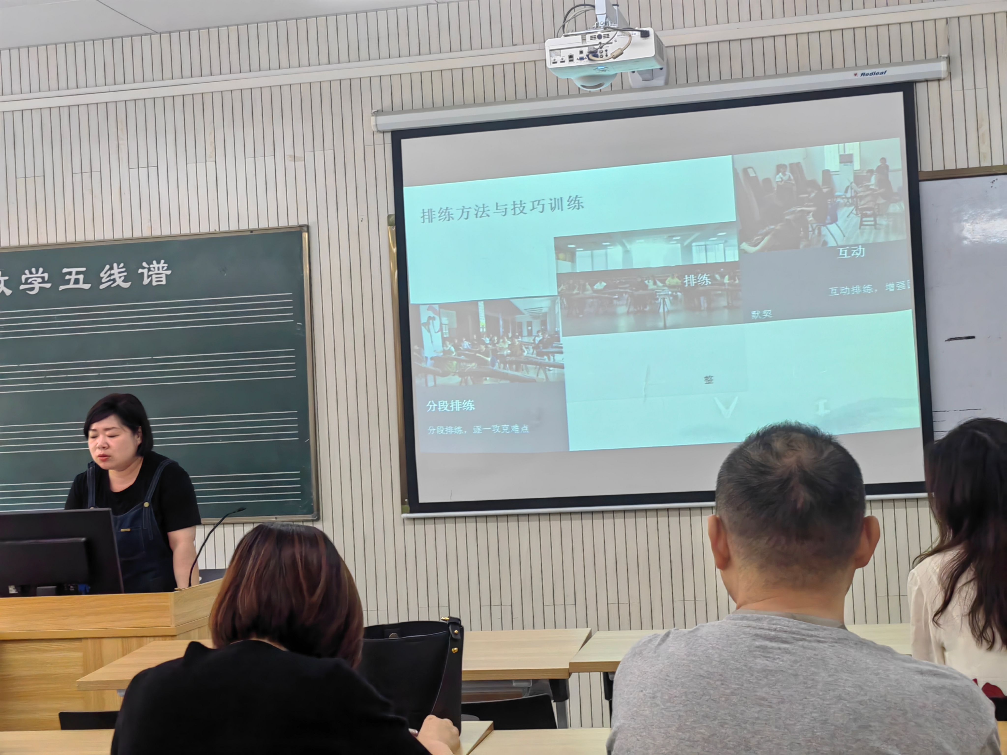 段莹滢老师介绍了自己本学期承担的教学课程及内容,主要围绕民乐团排练课背景与目的、排练课中的挑战与解决、排练课内容与形式以及排练课成果展示等方面进行了教学分享。首先,段莹滢老师向大家介绍了民乐团排练课背景与目的:1.通过排练课,推广民族文化,让更多人了解和欣赏民乐;2.民乐团排练课有助于乐团成员提升技艺,促进乐团整体发展。通过排练课的学习,能提高员工的演奏技巧,增强音乐表现力,还能加强团队合作,培养默契,提升整体演出效果。